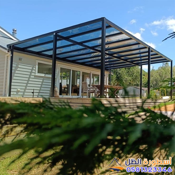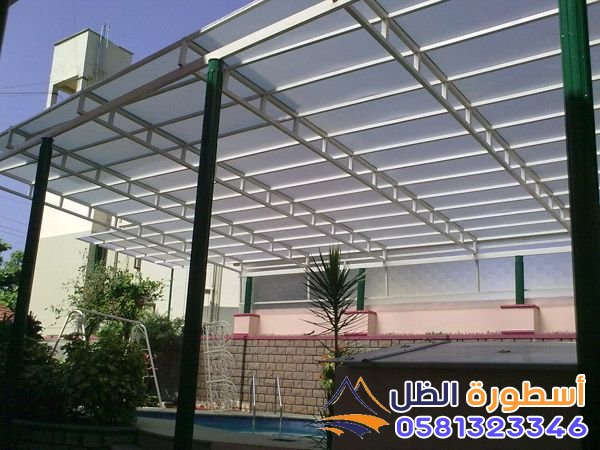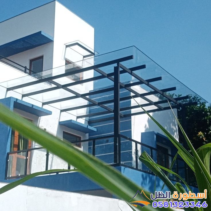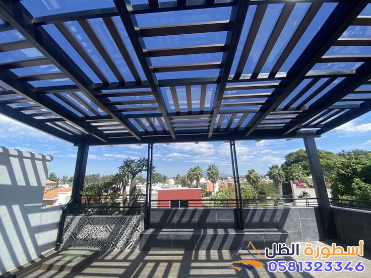 - مظلات لكسان (بولي كربونات): توفر حماية جيدة من أشعة الشمس مع السماح بدخول الضوء الطبيعي، وتتميز بوزنها الخفيف ومقاومتها للكسر.