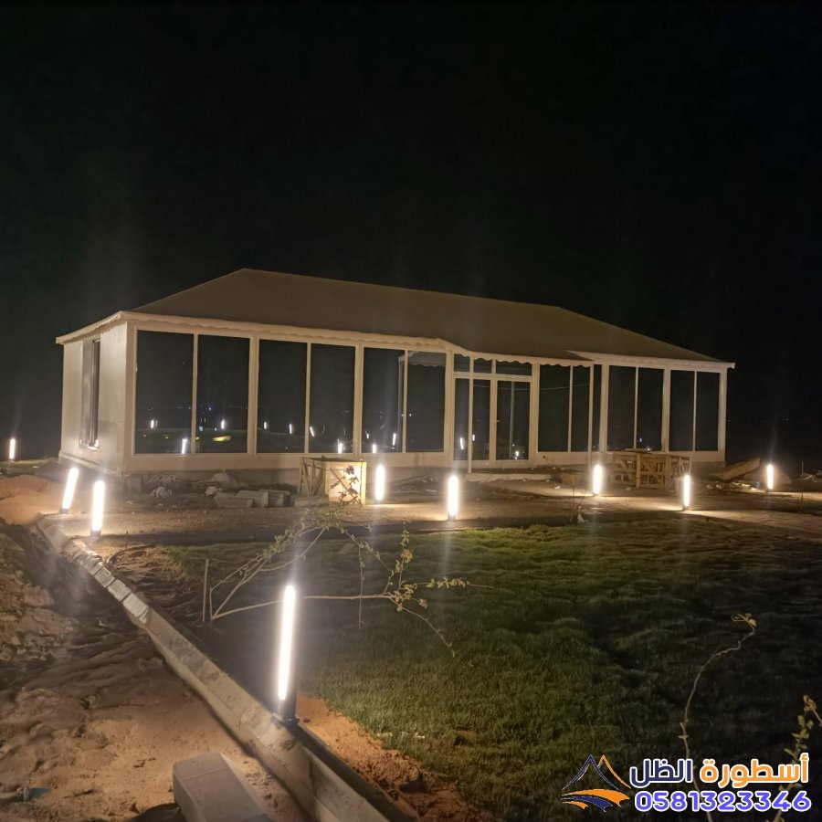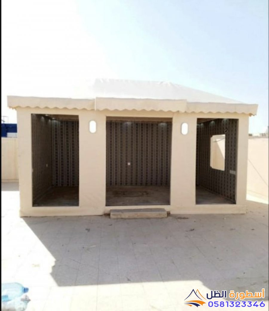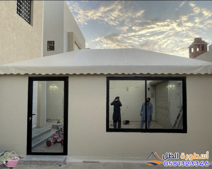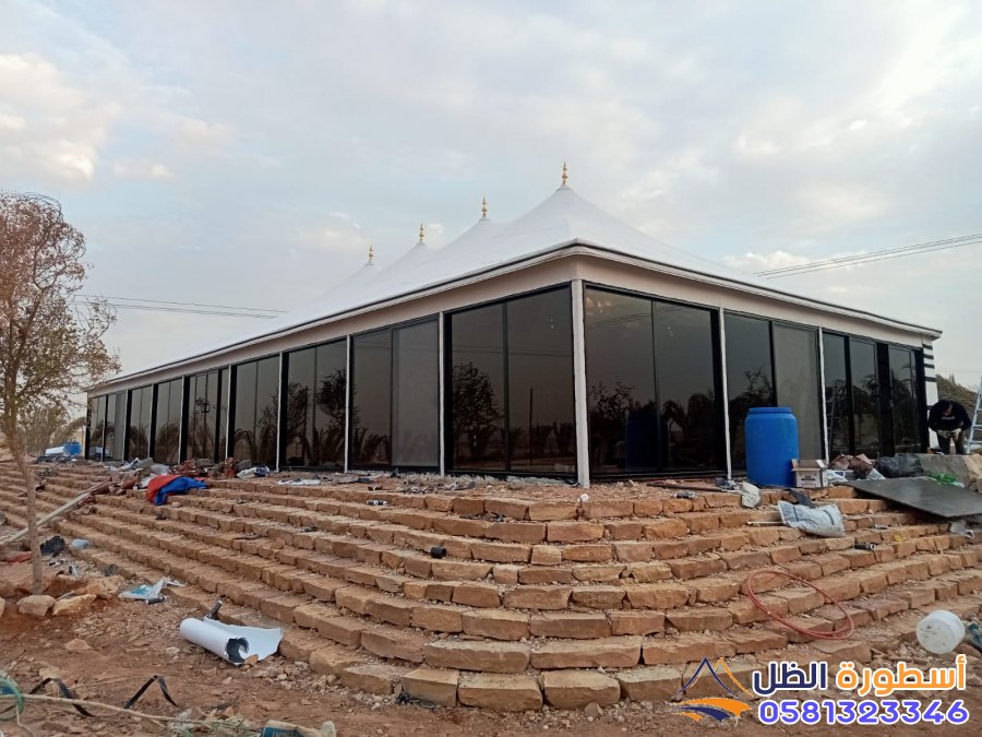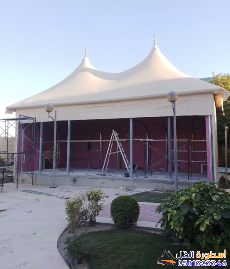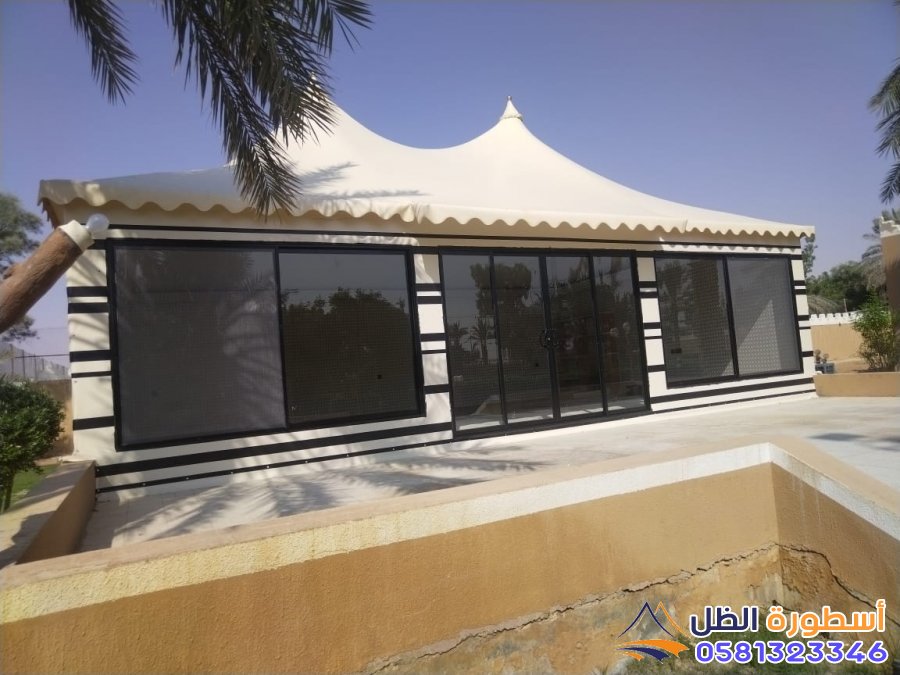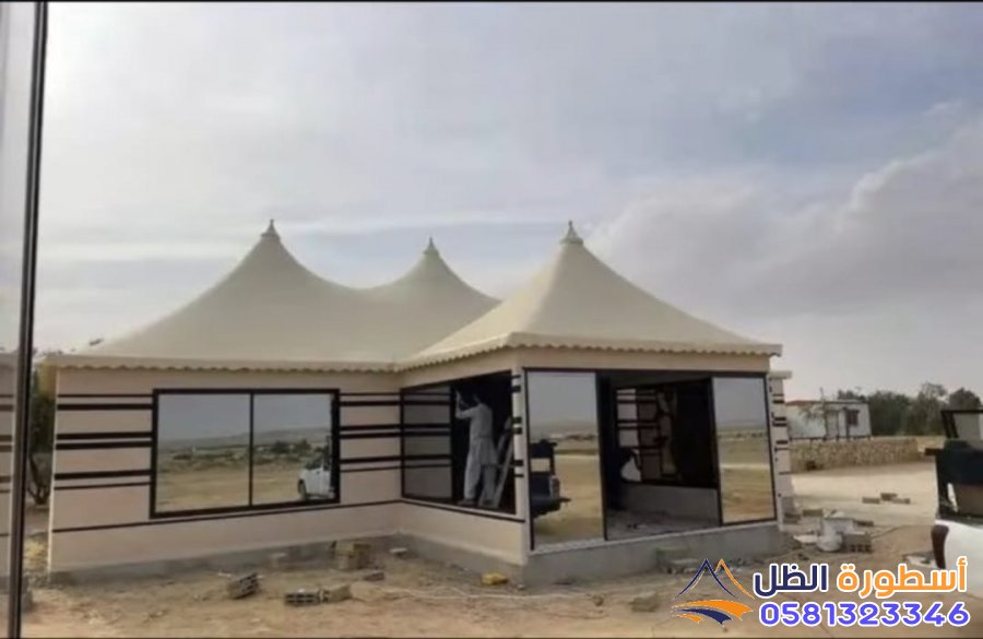 تركيب الغطاء الخارجي: تغطية الهيكل بالقماش الخارجي للخيمة، مع التأكد من تثبيته بشكل محكم.